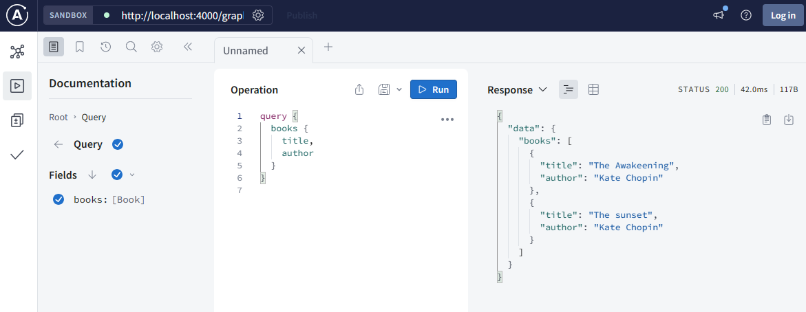 아래 예시는 제목(title)과 저자(author)로 표현해본 책(Book)이라는 스키마를 정의해본것이다. 여기서 필수(Mendatory)적인 값은 느낌표(!)를 사용해 나타내야 한다.