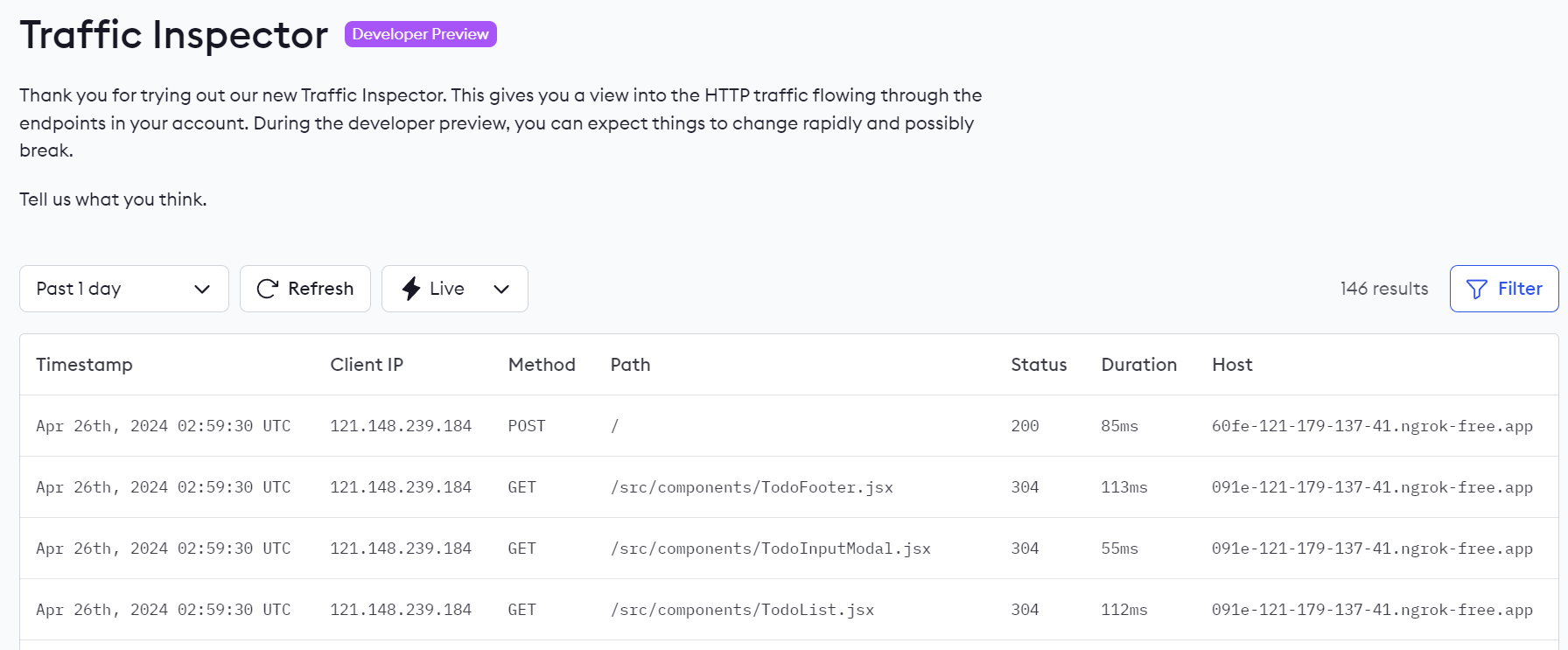 이렇게 터널링된 개발중인 서비스를 외부에서 접근해서 여러 디바이스에서 테스트를 해볼수 있게 되었고, 조금 더 편하게 갤이 진행되고 있다고 느꼈음. 이 기능은 ngrok DashBoard에 있음!